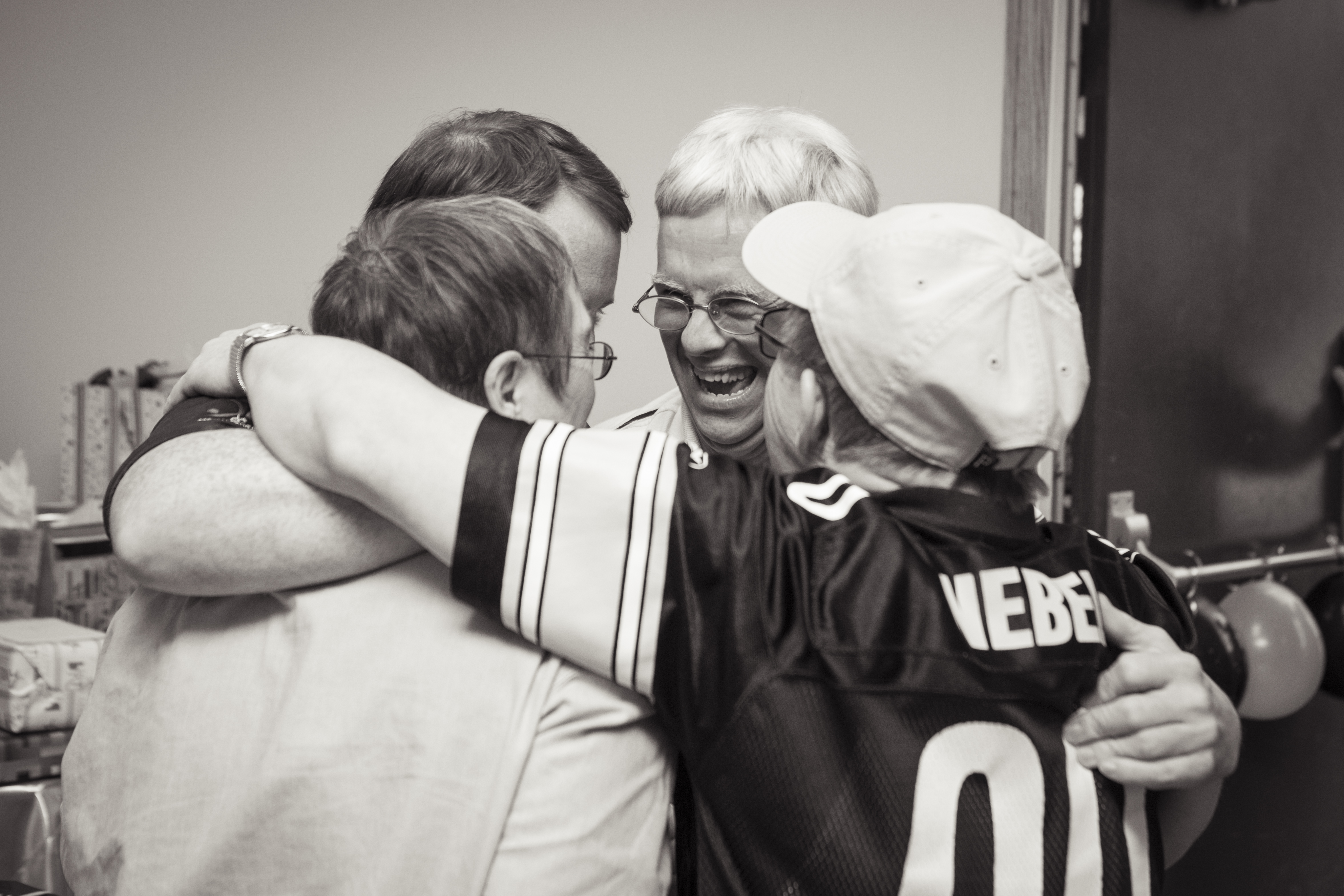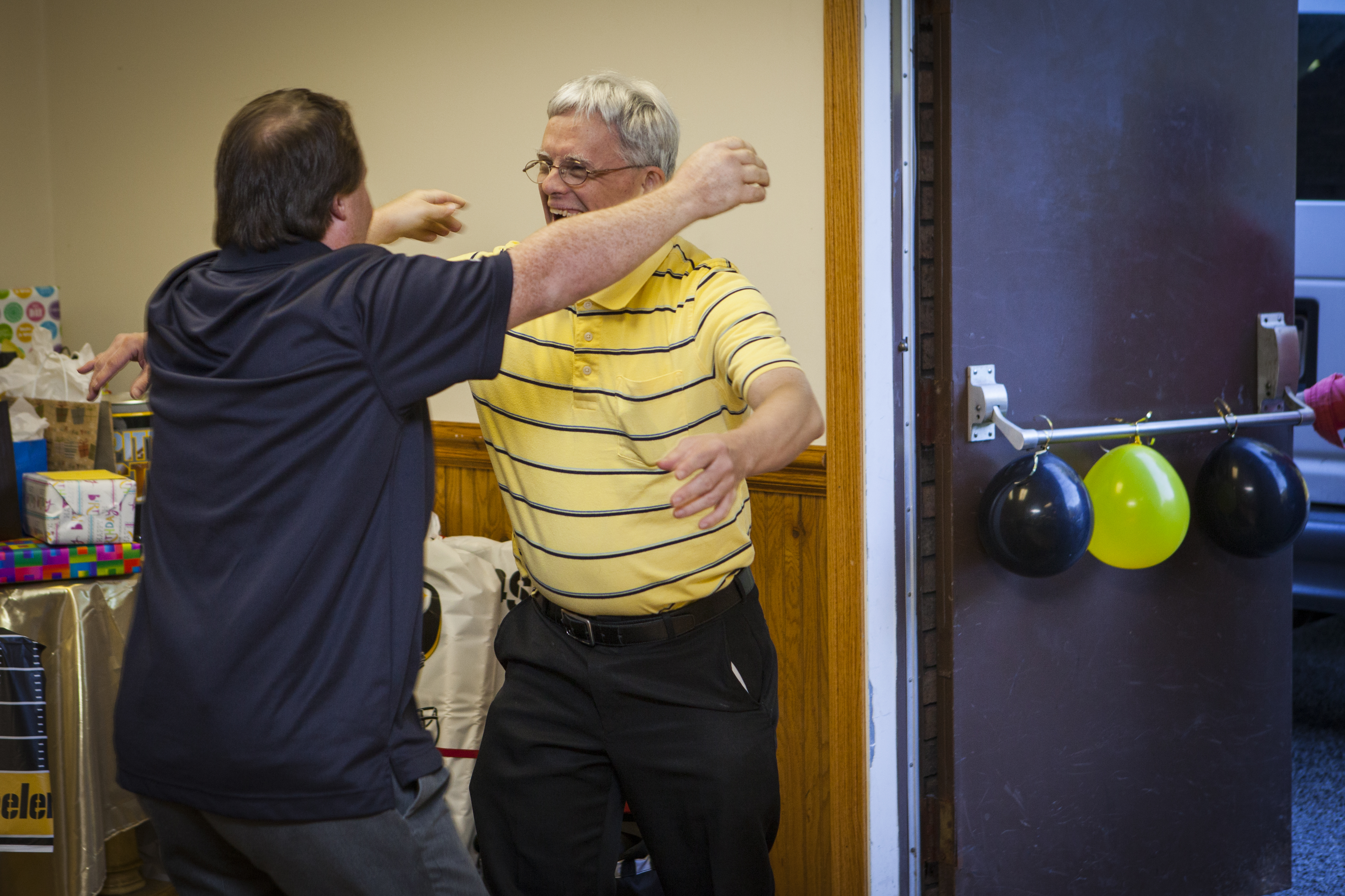 To set the tone for the party, this past week Tim and Dave had been at my parent’s house on their own version of a ‘vacation week.’ This involved copious amounts of WWE screenings and peanut butter milkshakes. Tim, who has known about the party for a few weeks, kept the secret of it’s upcoming arrival from David and couldn’t wait to see the look on his face when he came in the door. Much to my Uncle Bill and mother’s planning, David thought he was coming to a fish fry at the fire hall (they made fish fry signs and everything). Low and behold when he walked in everyone yelled surprise and Tim rushed him yelling, ‘I got you!’ After giving Dave a huge hug all Dave’s close friends came in and they all had a huge group hug. Seeing it and capturing it made me tear up behind the camera. What a special moment and a wonderful group of friends.