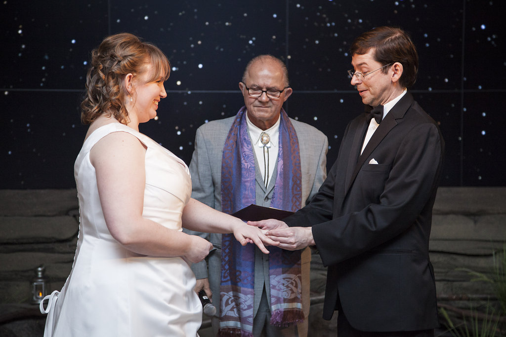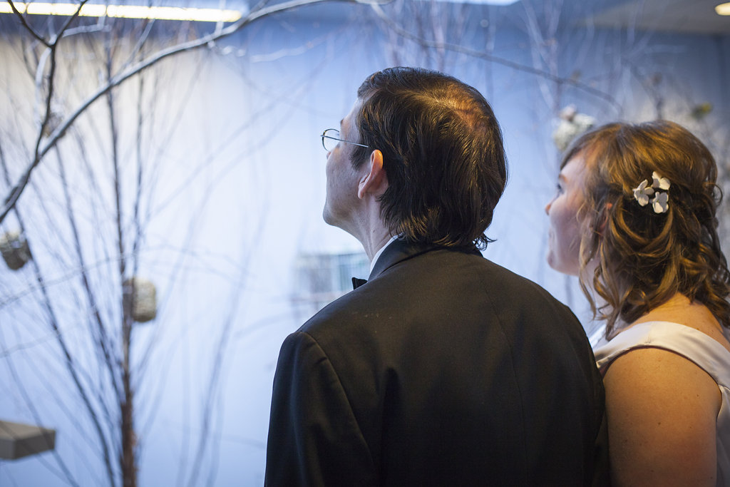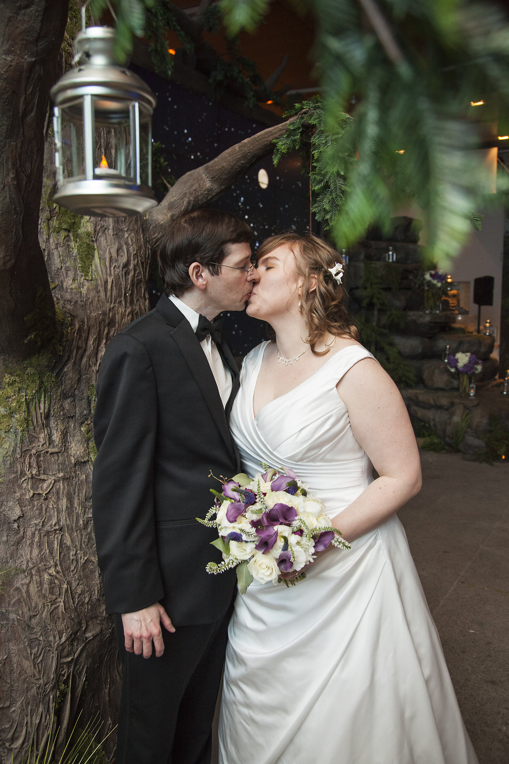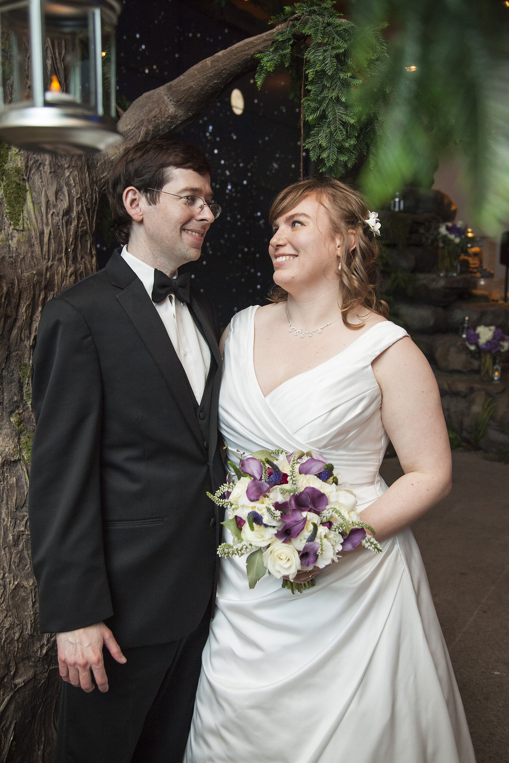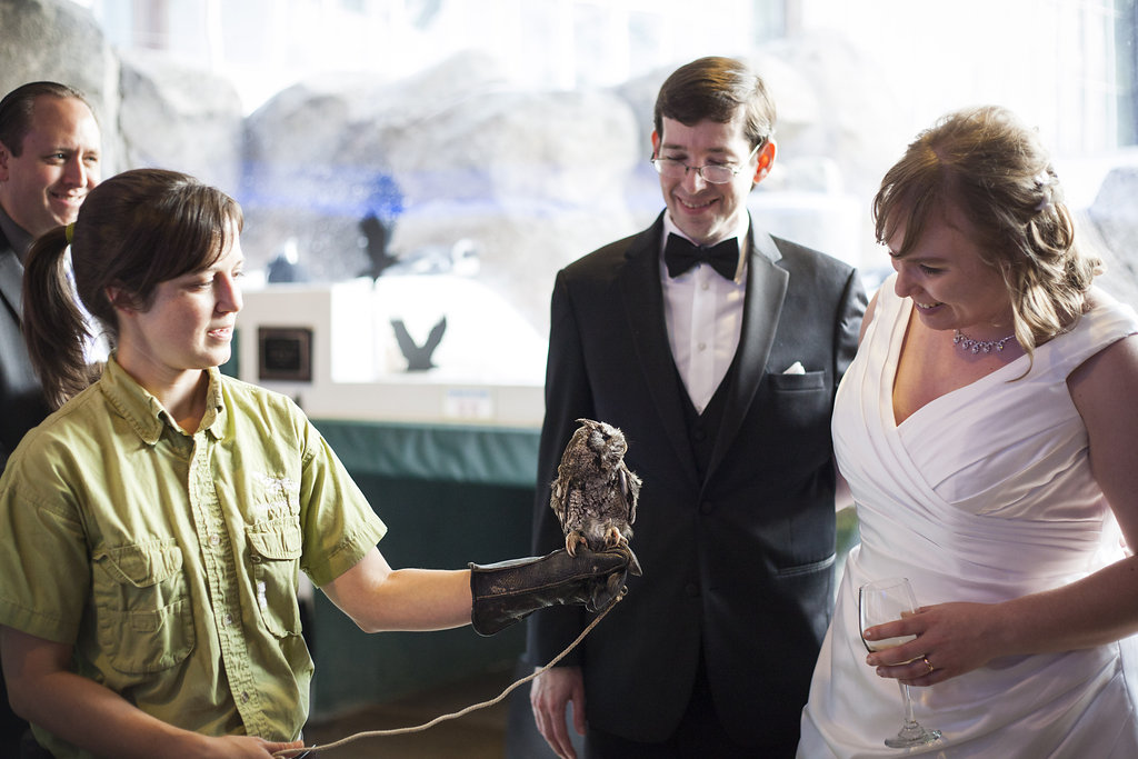 One of the most unique things about the whole wedding day was their ceremony which took place in the Aviary’s Flightzone Theater. There’s a huge tree in the middle, a big screen behind them (which they set as a night sky scene), and rock plateaus throughout. They decorated it with candlelit lanterns and big vase bouquets. It was stunning, like something out of a movie. Imagine getting married outside on a starlit night and voila! Beth and David’s ceremony. They gave each of their mother’s flowers and had their family members do some wonderful (and funny) readings. Everyone had a chuckle when they exited the ceremony to Star Wars (not once, but twice!) only to be greeted by a penguin named Goldie outside the theater.