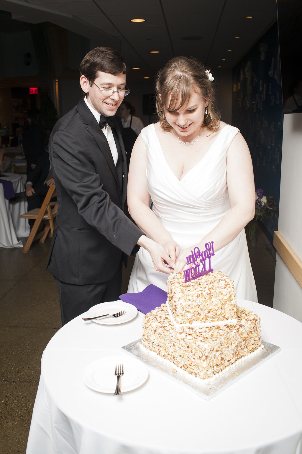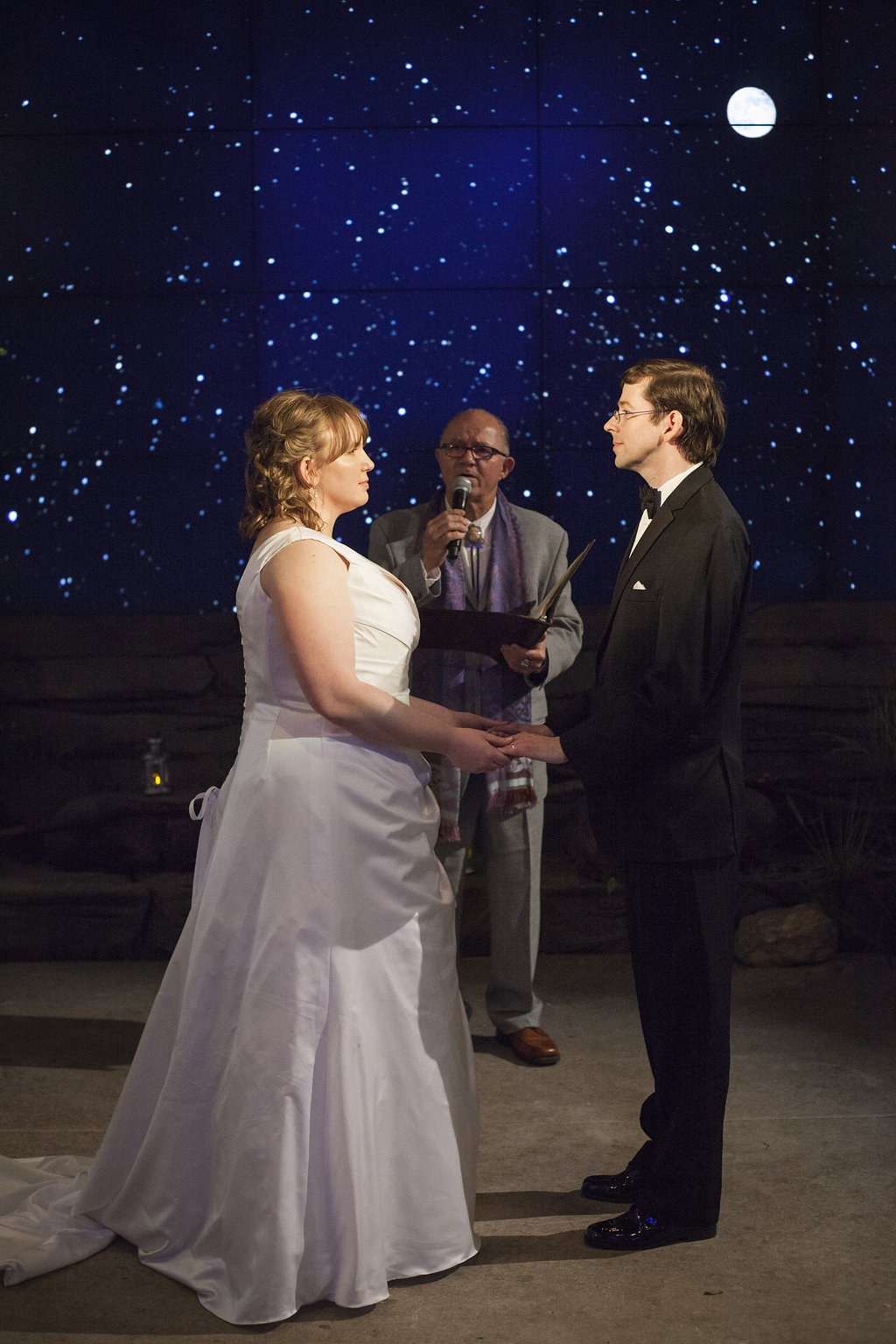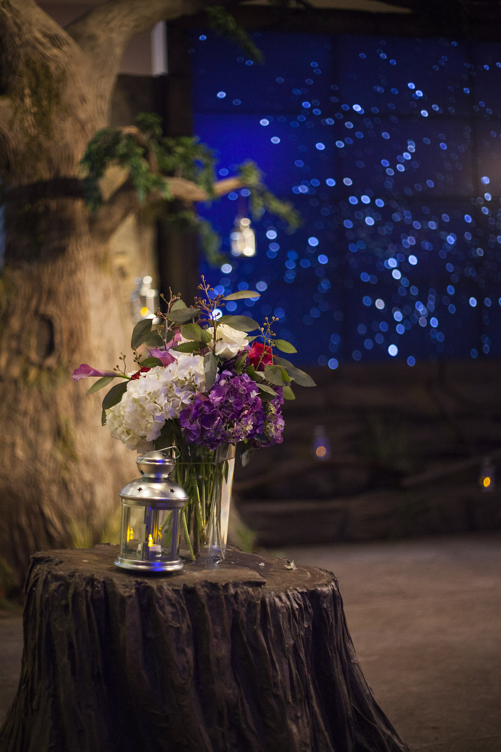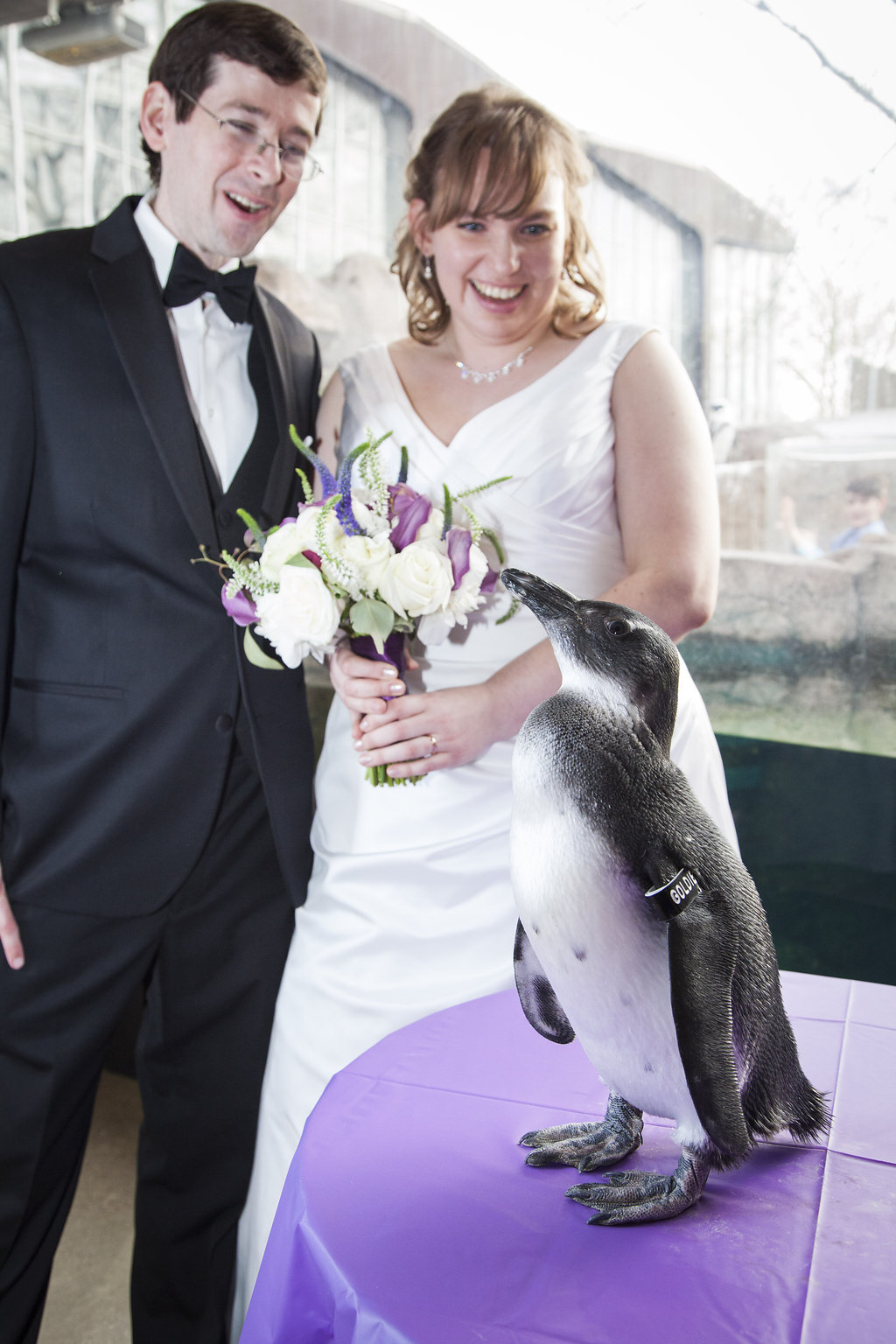 One of the most unique things about the whole wedding day was their ceremony which took place in the Aviary’s Flightzone Theater. There’s a huge tree in the middle, a big screen behind them (which they set as a night sky scene), and rock plateaus throughout. They decorated it with candlelit lanterns and big vase bouquets. It was stunning, like something out of a movie. Imagine getting married outside on a starlit night and voila! Beth and David’s ceremony. They gave each of their mother’s flowers and had their family members do some wonderful (and funny) readings. Everyone had a chuckle when they exited the ceremony to Star Wars (not once, but twice!) only to be greeted by a penguin named Goldie outside the theater.