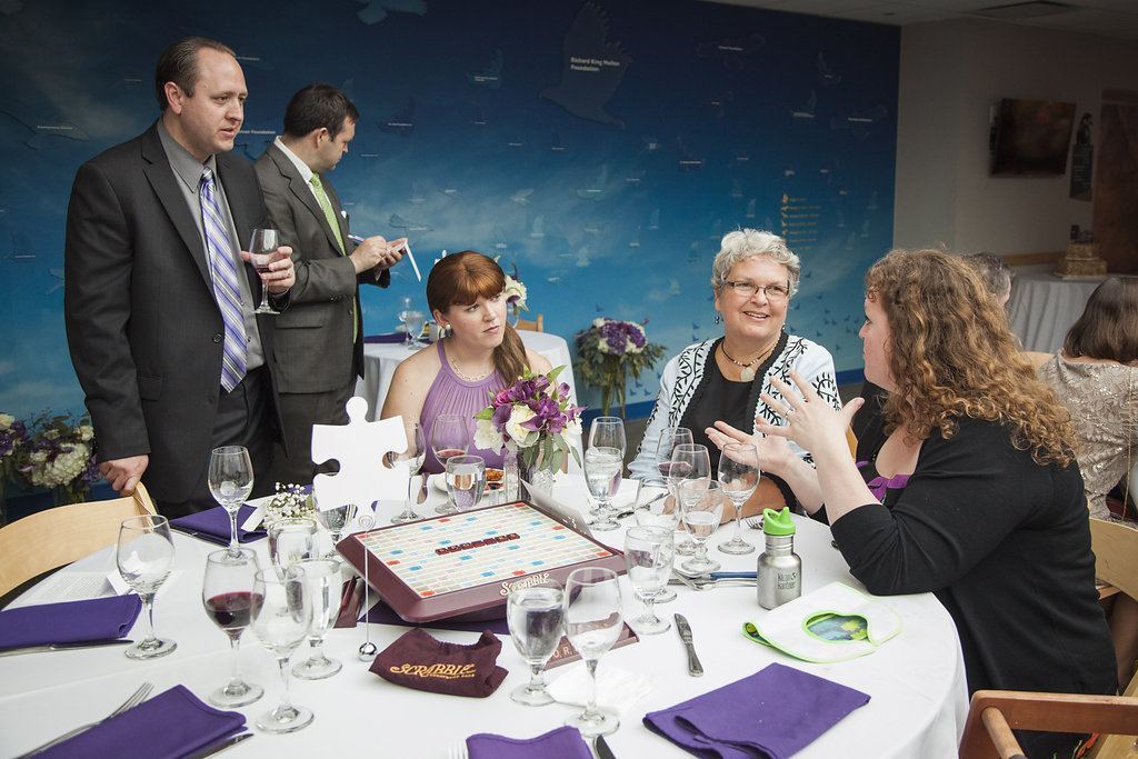 Beth and David, seriously one of the most unique and fun weddings I have photographed to date! I mean, what a venue! The National Aviary in Pittsburgh is truly a hidden gem. How many photographers can say they’ve photographed weddings guests that included penguins, parrots and owls! The best thing about this wedding was that it was very distinctly Beth and Davids. They swerved from your traditional and did something so true to them. Let me explain… they had met at a board gamy party that was hosted by a mutual friend. Their love of games and meeting one another was placed throughout the wedding. They had a puzzle hunt where guests had to collect clues, board game center pieces decked out in bridal gear, and instead of a first dance they chose to play the Broken Picture Telephone game (basically everyone started with a ring a blank cards, drew a picture or a phrase, passed it to the guest next to them who had to either draw a phrase or figure out what the picture was and describe it). The end results were hysterical! Beth and David became ‘guest players’ at each table and injected their drawings or phrases in everyone’s cards.